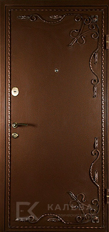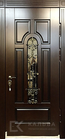 Фото «Стальная дверь орех с арочным стеклом кованым узором и резьбой №7»